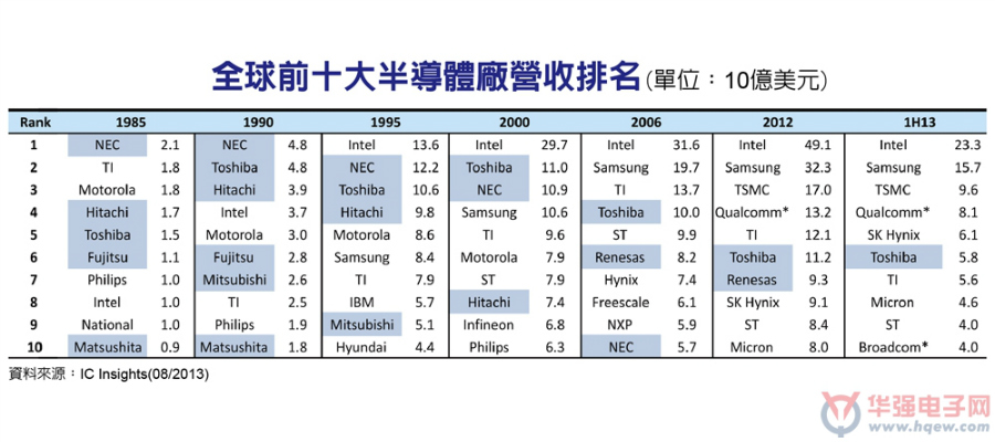 IC Insights日前公布2013年上半年全球前十大半導體廠營收排名,其中,日本半導體業者受到產業競爭加劇及垂直整合商業模式式微的衝擊,進榜業者已愈來愈少,目前僅存東芝(Toshiba)一家仍榜上有名,相較於1990年時最多六家同時上榜的紀錄已大幅減少马